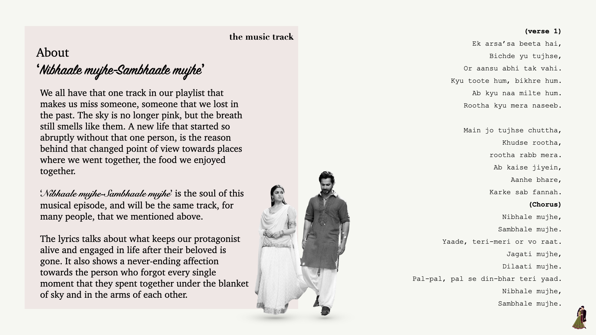 Along with a 40-minute runtime, each episode will also feature an original song and music video. “Nibhaale Mujhe-Sambhaale Mujhe” (Fulfill me, take care of me) is the soul of our Pilot episode. The song is a tale about what keeps us alive and engaged in life after a heartbreak.